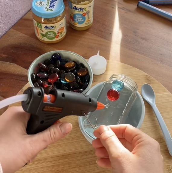 Upcycling leicht gemacht: Zaubere aus leeren Alete Gläschen und Glasnuggets farbenfrohe Windlichter, die buntes Licht ins Haus zaubern.