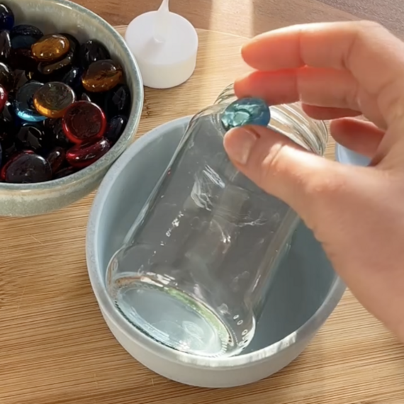 - Das Gläschen rundum mit Glasnuggets bekleben.